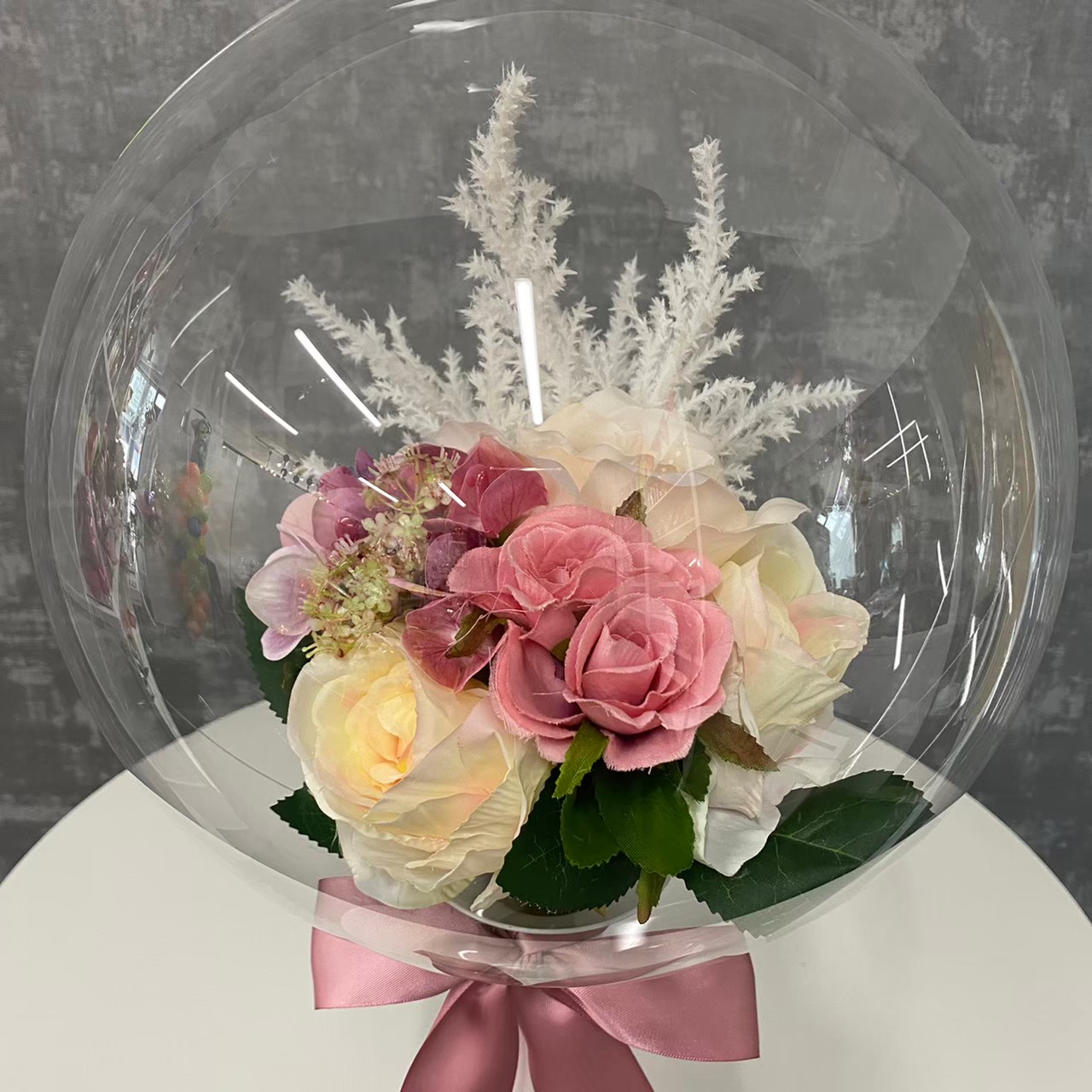 フェザーインバルーン(羽入りクリア風船)を使った、バルーンブーケです。
